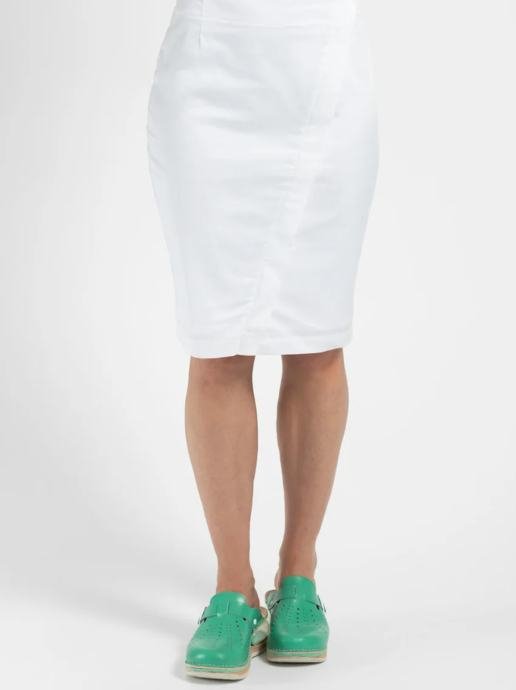 Suknja je midi kroja, dužine do koljena, klasičnog ravnog silueta.