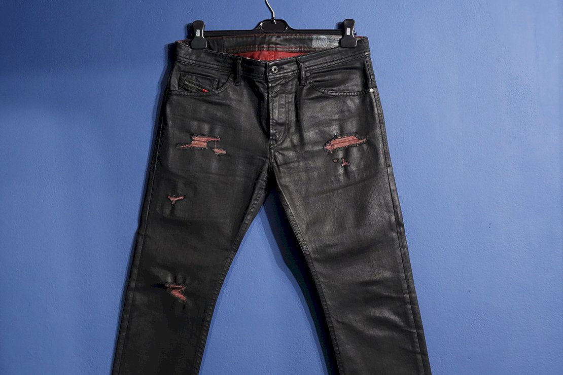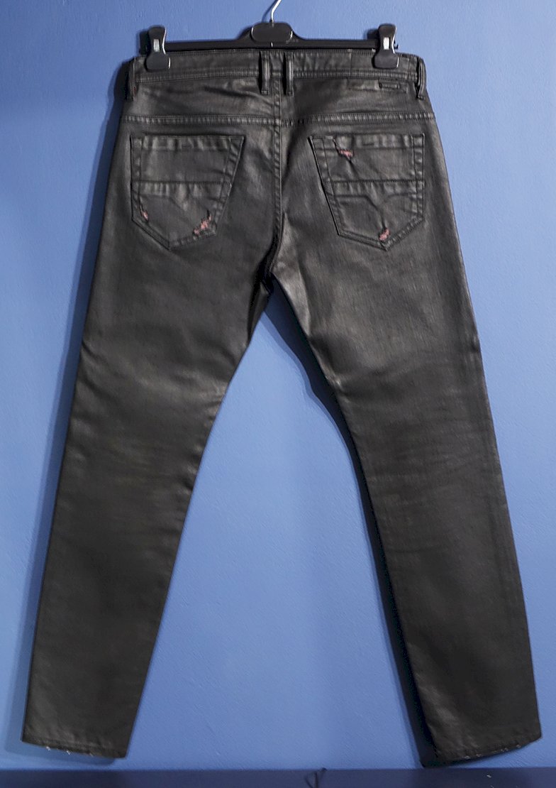 Diesel x AC Milan slim fit crne lakirane traperice (coated jeans) s crvenim detaljima. Veličina: W 33 L 32. Rijetko nošene i izvrsno očuvane. Iznimno rijedak model koji je dio posebne kolekcije kreirane u suradnji s nogometnim klubom AC Milan. Original. Proizvedene u Italiji u limitiranim izdanju.