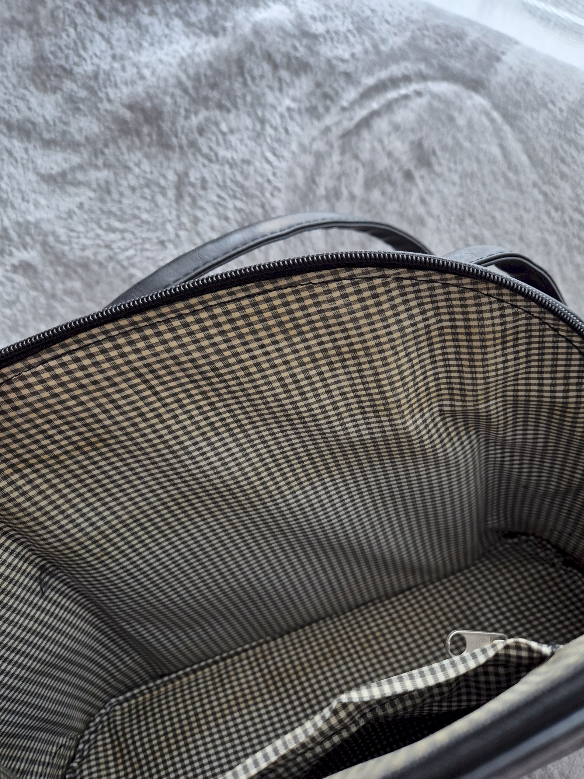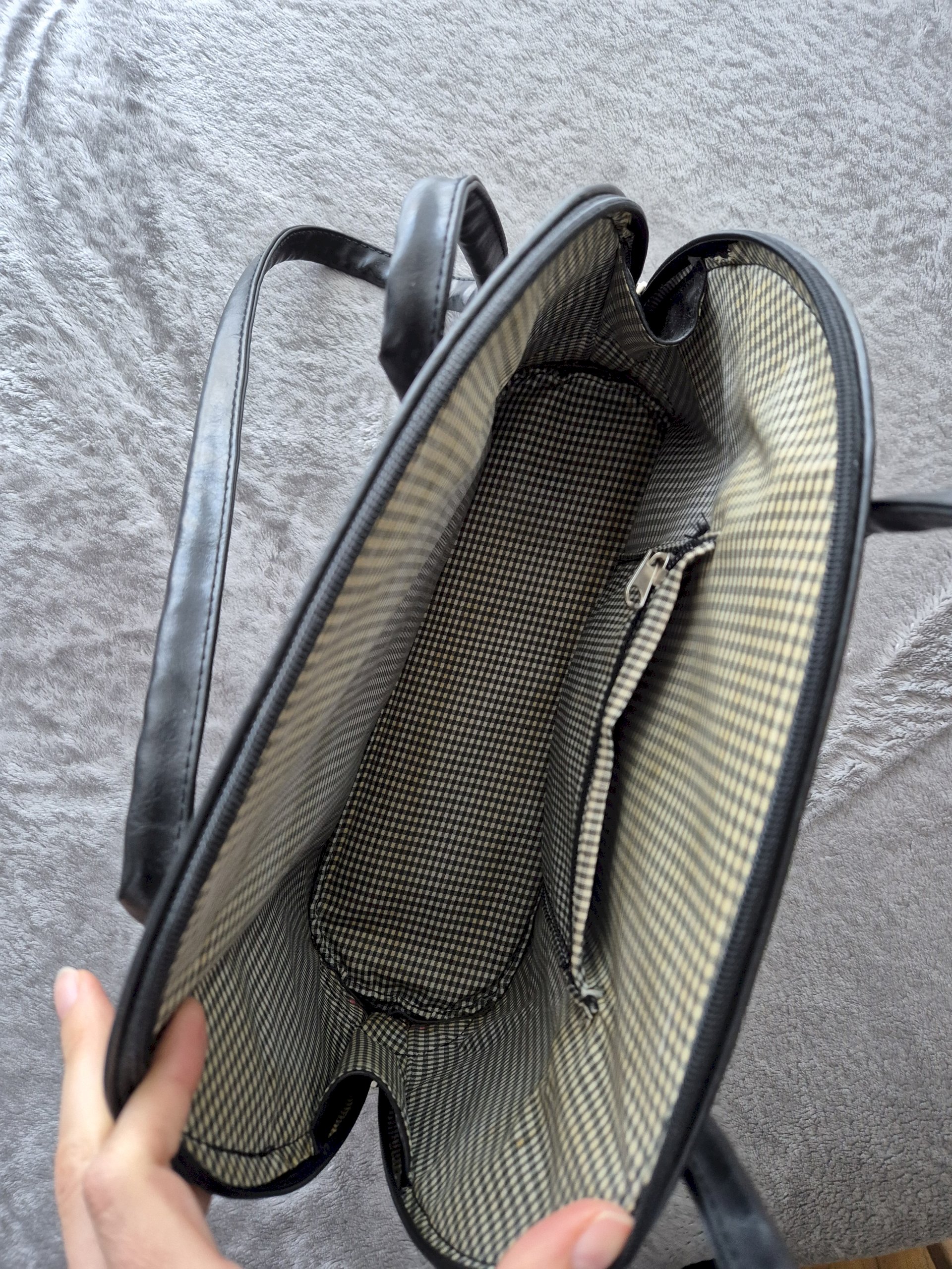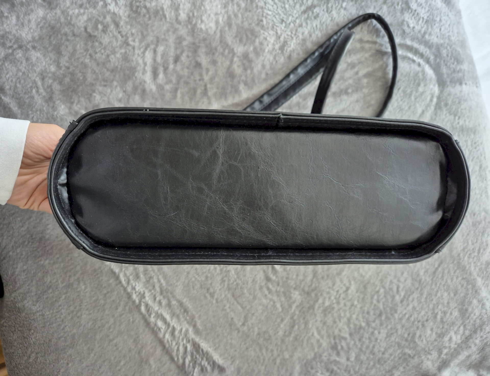 Kupljena u second hand trgovini, kruta i čvrsta s dovoljno dugim ručkama. Iznutra ne izgleda najbolje, ali je moguće očistiti. Kožna je iako nema deklaraciju jer nema onaj oštar miris plastike, tekstura je nepravilna (linije na površini) i upija vodu u dodiru s njom.