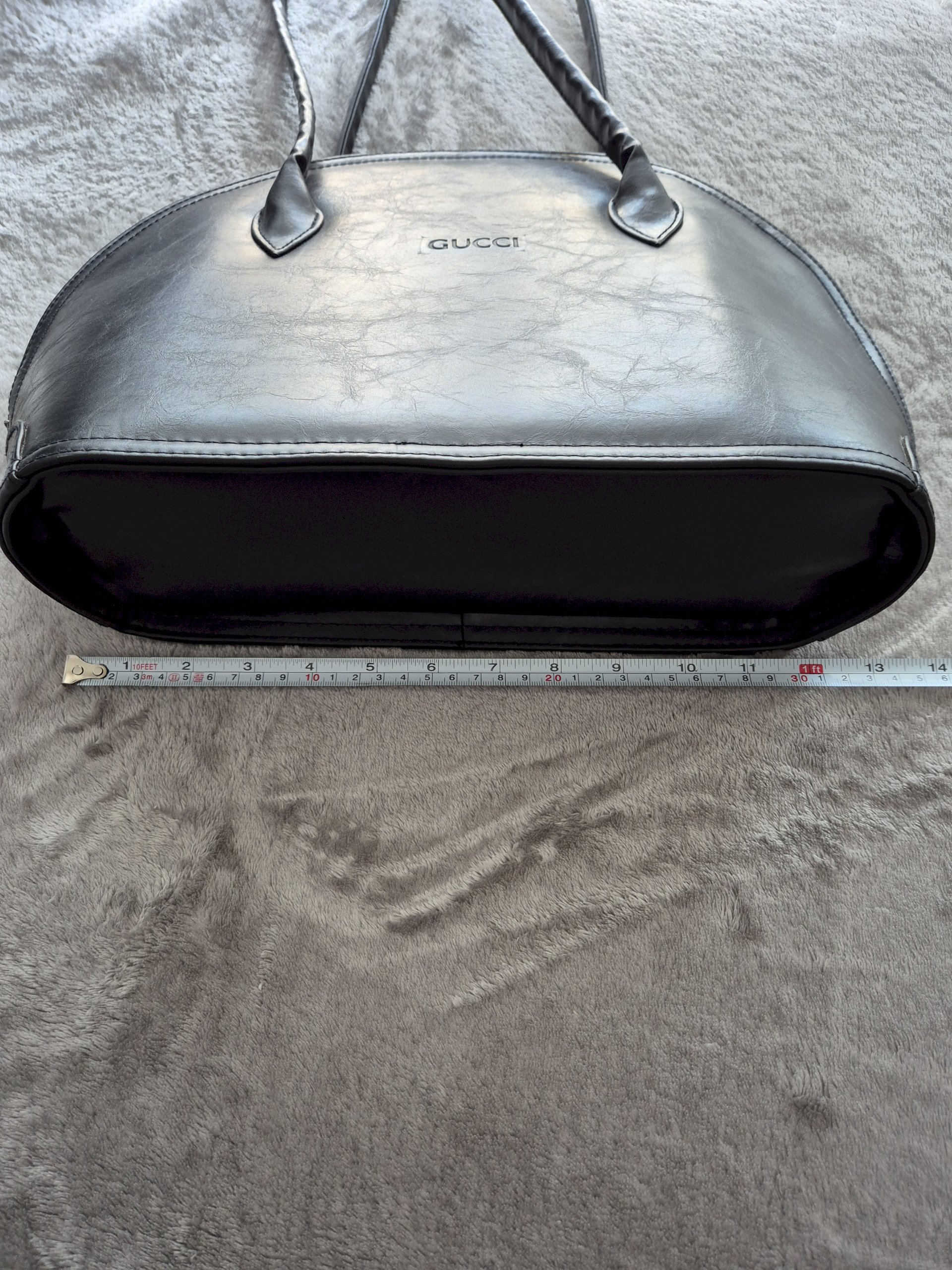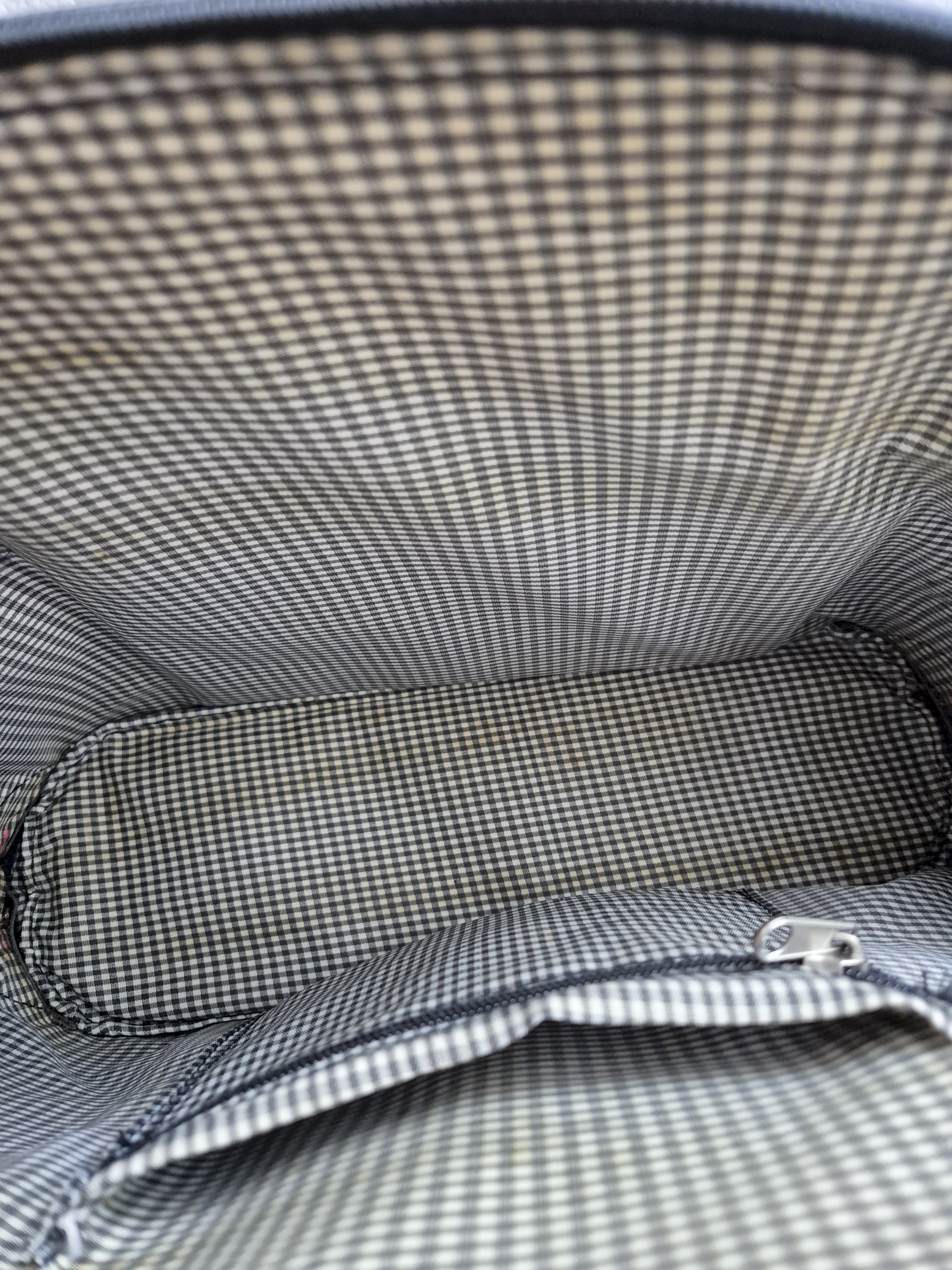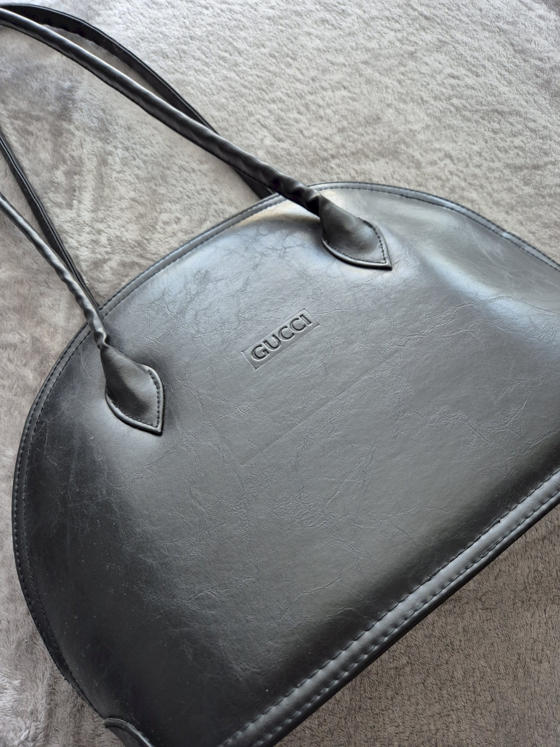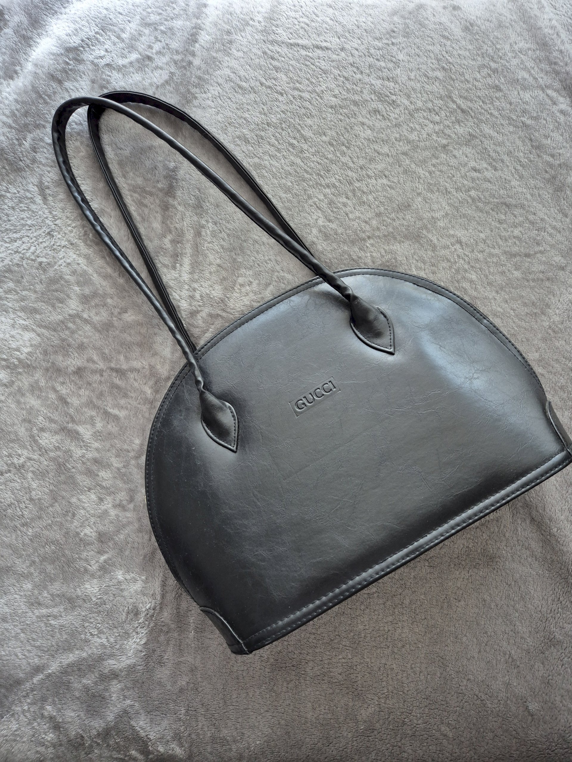 Kupljena u second hand trgovini, kruta i čvrsta s dovoljno dugim ručkama. Iznutra ne izgleda najbolje, ali je moguće očistiti. Kožna je iako nema deklaraciju jer nema onaj oštar miris plastike, tekstura je nepravilna (linije na površini) i upija vodu u dodiru s njom.